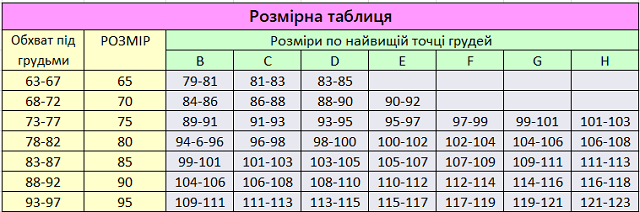 Його розмір визначається двома параметрами — цифрою і літерою. Цифра — це обхват під грудьми в сантиметрах, а літера — розмір чашки. Наприклад, 75 В.