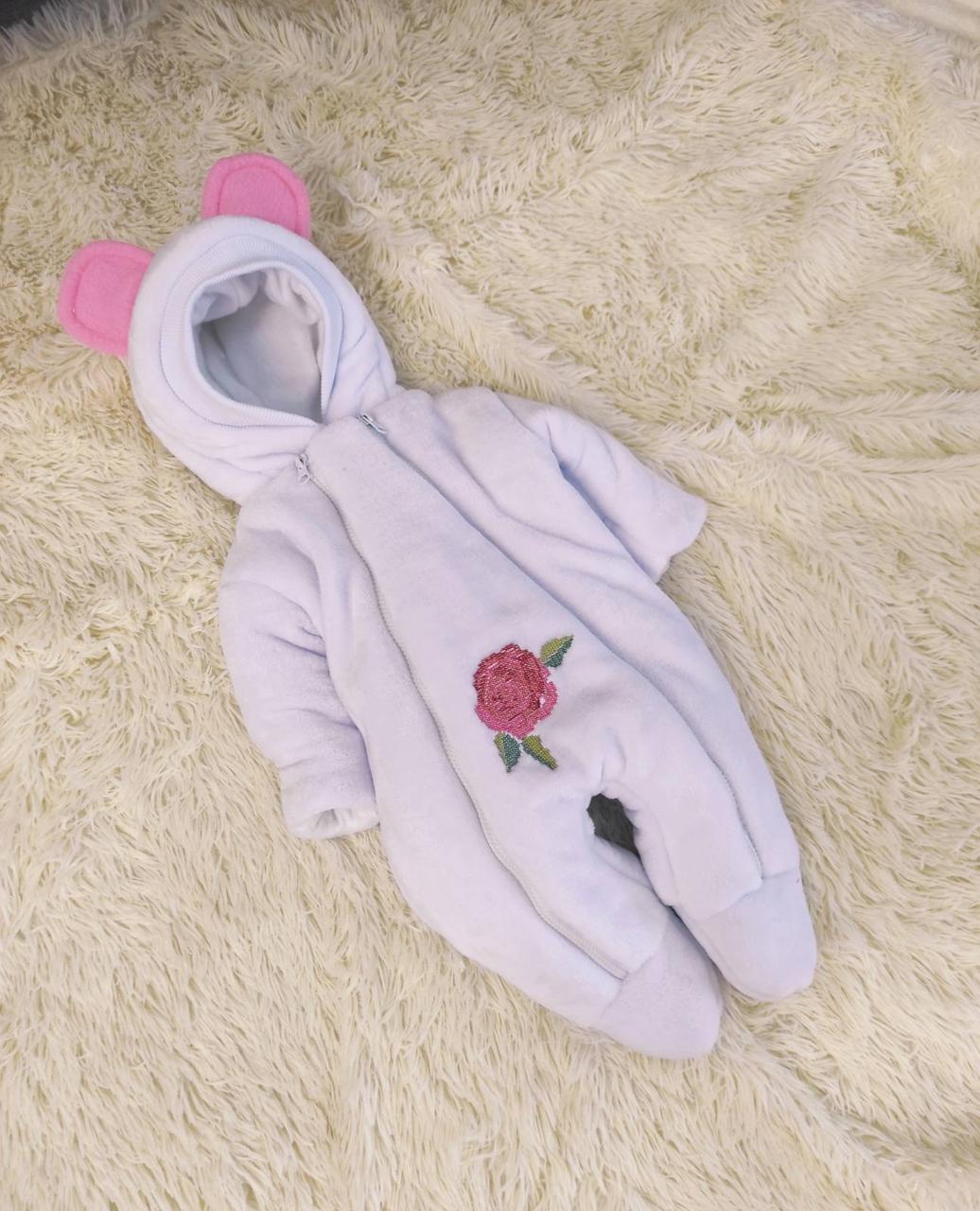 Дитячий комбінезон для новонароджених малюків. Виконаний з махри, утеплений синтепоном, підкладка із флісу, прикрашений вишивкою. Комбінезон на двох блискавках з глибоким капюшоном з окантовкою для захисту обличчя малюка від вітру. Корисними деталями комбінезона є: ручки малюка, що закриваються, і застібка на липучці, для захисту шиї дитини від холоду - можна не використовувати шарфик