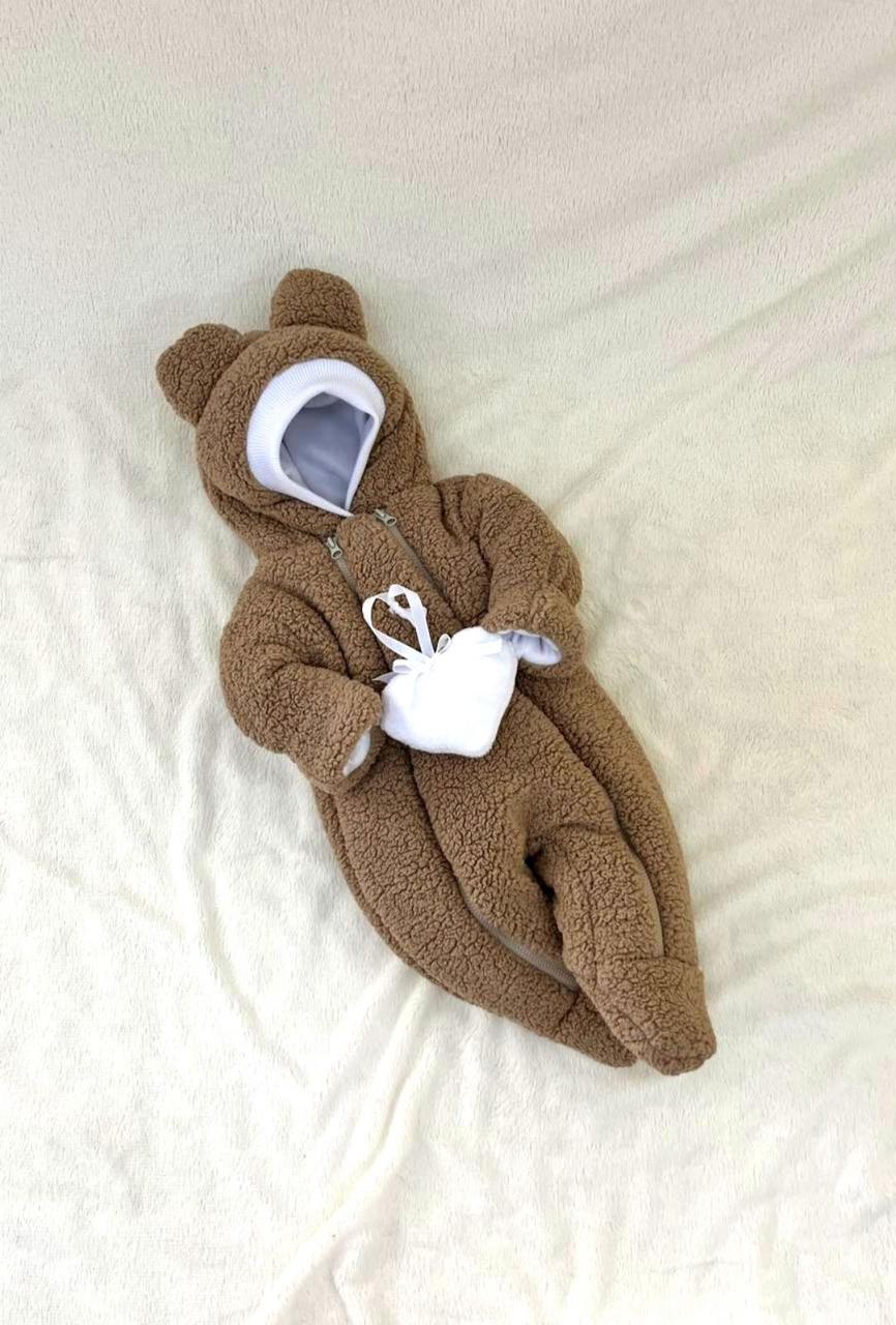 Виконаний зі штучного хутра Тедді, утеплений синтепоном, підкладка із теплого флісу. Комбінезон на двох блискавках з глибоким капюшоном з окантовкою з м'якої рібани для захисту обличчя малюка від вітру. Корисними деталями комбінезона є: ручки малюка, що закриваються, та застібка на липучці для захисту шиї дитини від холоду - можна не використовувати шарфик.