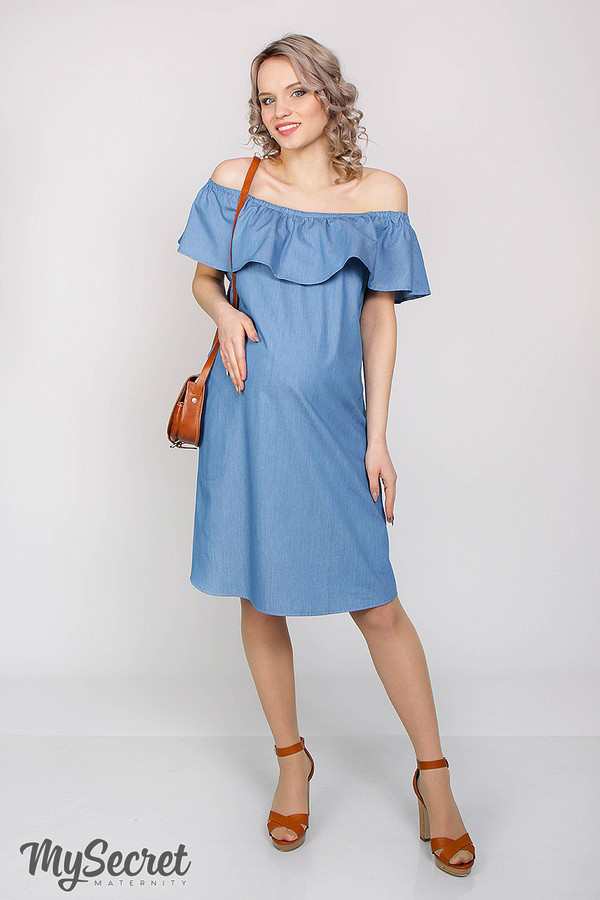Ультра модне гарне плаття для вагітних та годуючих з тонкого джинсу. Завдяки спеціальному крою широкий волан по плечах можна по-різному носити: одягаючи на плечі або кокетливо стягуючи. Летить низ чудово маскує округлі форми та не сковує рухів. Секрет годування захований під воланом в нагрудних рельєфах, (потаємні блискавки). У комплекті входить поясок.